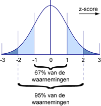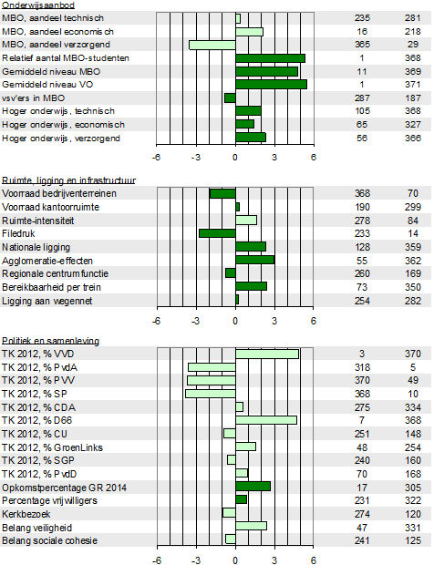 Toelichting: In totaal zijn 106 indicatoren onderscheiden. (Zie Profielen per gemeente voor een overzicht). Sommige daarvan kunnen als 'gunstig of ongunstig' worden beschouwd, andere als 'neutraal'. Voor acht rubrieken is een totaalscore bepaald voor de indicatoren die als gunstig/ongunstig kunnen worden beschouwd. De rubriek 'Politiek en samenleving' bestaat voornamelijk uit 'neutrale' indicatoren. De kansverdeling van de scores staat in onderstaande figuur.