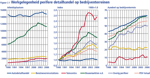 Opdrachtgever: Provincie Zuid-Holland Detailhandel lijkt sterk te groeien op bedrijventerreinen. De Provincie Zuid-Holland vraagt zich af of daaruit blijkt dat het detailhandelsbeleid faalt. Dat beleid houdt in dat detailhandel in principe niet op bedrijventerreinen mag vestigen, met uitzondering van een aantal specifiek aangewezen branches waar volumineuze goederen worden verkocht (bijvoorbeeld autos en meubels), de zogenaamde perifere detailhandel. Uit het onderzoek van Bureau Louter blijkt dat het aantal arbeidsplaatsen in de detailhandel in Zuid-Holland op bedrijventerreinen inderdaad sterker groeit dan elders, maar dat geen sprake is van falend beleid. Ten eerste groeien de perifere detailhandelbranches gemiddeld sterker dan de overige detailhandel. Ten tweede verplaatst een steeds groter deel van de perifere detailhandel naar bedrijventerreinen. Dat is niet in strijd met het beleid. Van de overige detailhandel is slechts een zeer klein deel op bedrijventerreinen gevestigd. Klik op de verkleinde weergaven hieronder om een grote weergave te zien.