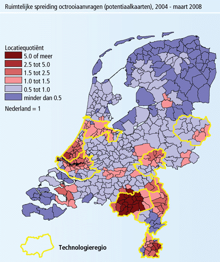 Opdrachtgever: Platform Bètatechniek De hoofdstukken 6 (Regionale arbeidsmarkt voor bètatechnici, 2011-2015) en 7 (Regionale verschillen in octrooiaanvragen) uit de Technomonitor 2010 zijn opgesteld door Bureau Louter. Een uitvoeriger verslag daarvan staat in de door Bureau Louter opgesteld PlatformPocket 29: De regionale arbeidsmarkt voor technici tot 2016. Speciaal topic: Octrooiaanvragen per regio). Daarin worden op regionaal niveau (voor 30 regios) confrontaties van vraag en aanbod opgesteld voor 37 technische opleidingen. Tevens staat in het rapport een uitvoerige analyse van ruimtelijke verschillen in het aantal octrooiaanvragen. Zie onderstaande illustratie voor de ruimtelijke spreiding van octrooiaanvragen. Weergegeven is de relatieve vertegenwoordiging, waarbij het nationaal gemiddelde op 1 is gesteld. In de figuur zijn tevens de zeven technologieregios weergegeven waarvoor door Bureau Louter in opdracht van Platform Bèta Technniek technologiepockets zijn opgesteld.